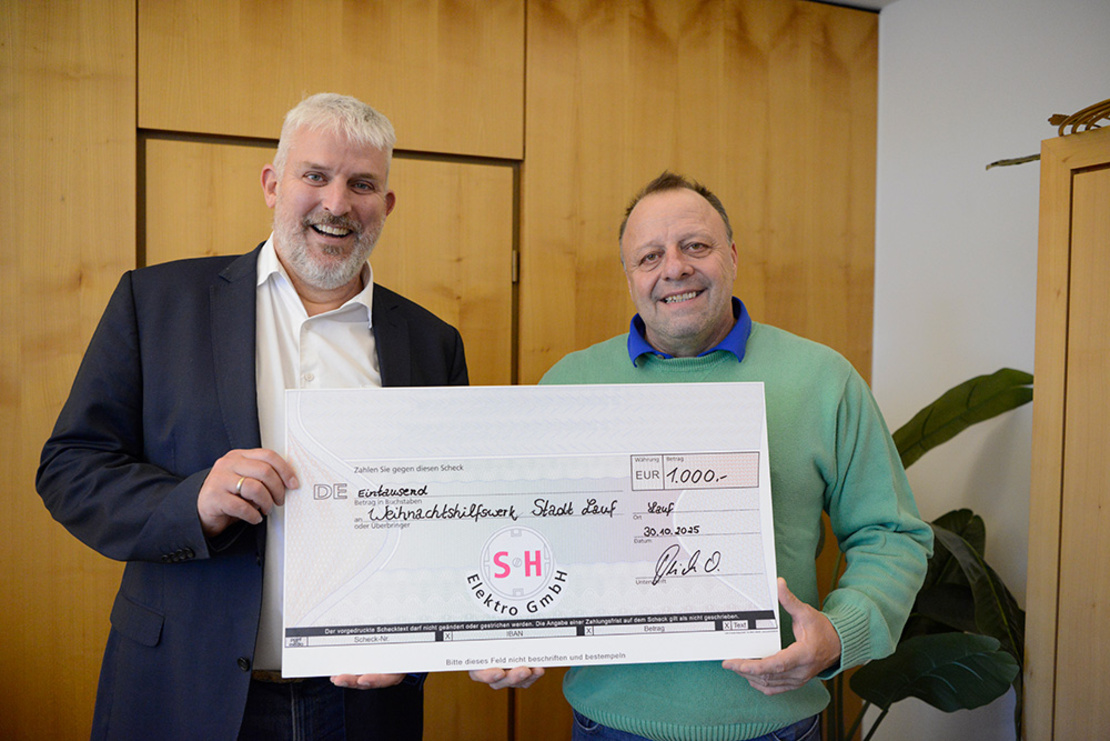 Freuen sich gemeinsam über die Spende für das Laufer Weihnachtshilfswerk: Oliver Heidenreich, Geschäftsführer SH Elektro GmbH, und Thomas Lang, 1. Bürgermeister Stadt Lauf.